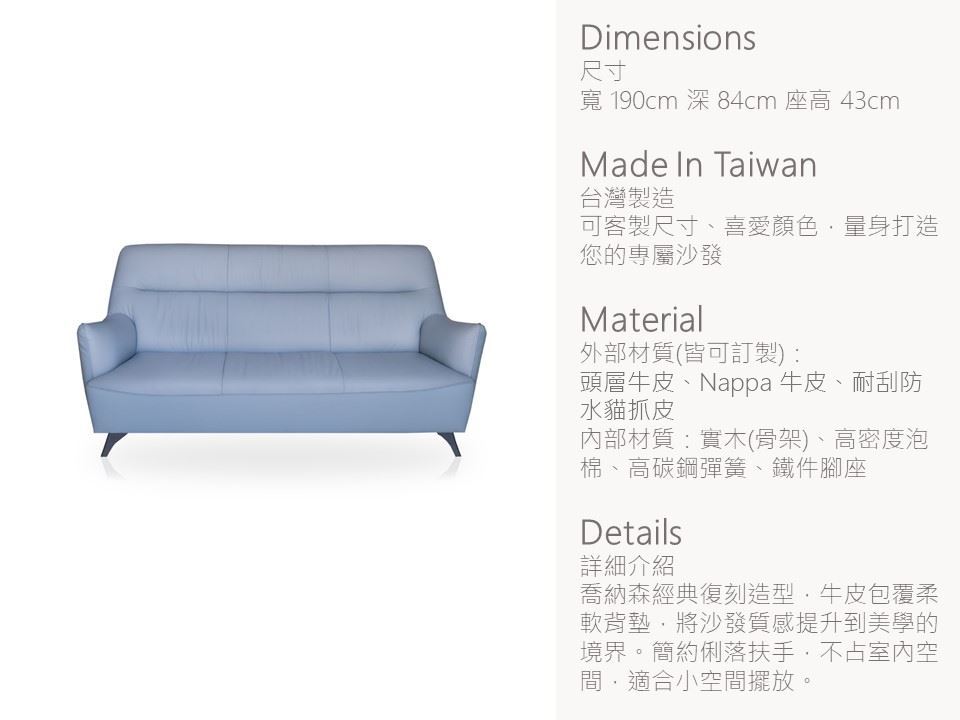 • 專為小空間打造 復刻造型—喬納森經典復刻造型,牛皮包覆柔軟背墊,將沙發質感提升到美學的境界。簡約俐落扶手,不占室內空間,適合小空間擺放。